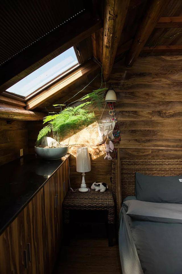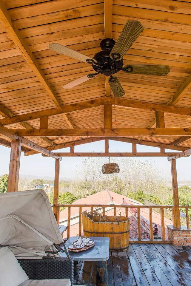 最喜歡三樓的閣樓房間,屋內都是木頭裝修的,古樸原始,旁邊就是大陽臺,可以看見遠處的城西水庫,三樓頂上還有一個乘涼的棚子,超級漂亮。