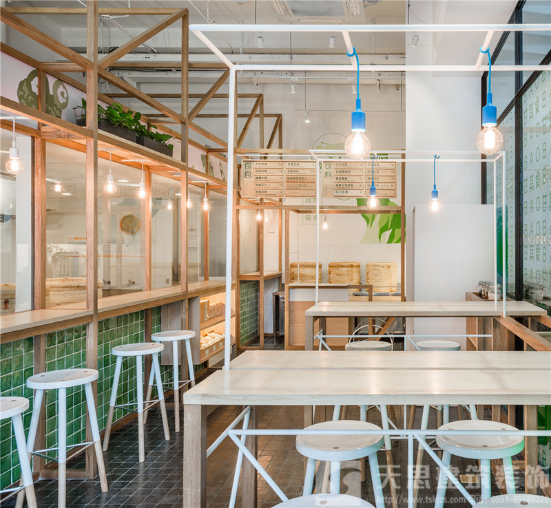 在室內空間結構上,我們傾注了大量巧思。玻璃間是包點制作區(qū),制作人員在玻璃間內完成搟面、包餡和蒸制等一系列工序。玻璃間外的上部空間由木質框架勾勒,以墻上的品牌標志為背景,擺放著盆盆綠植,枝條垂墜而下,清新可人。空間下部加入了吊燈和座位,一方面使得整體結構更為完整,另一方面便于食客觀察了解制作過程。玻璃間上部兼具玻璃與木頭兩種質感,下部的墻體由手工拋光的綠色瓷磚鋪就。店外,玻璃間的一面正對街頭,外延的木質擱板既為顧客提供便利,也使得店鋪內外更為渾然一體。