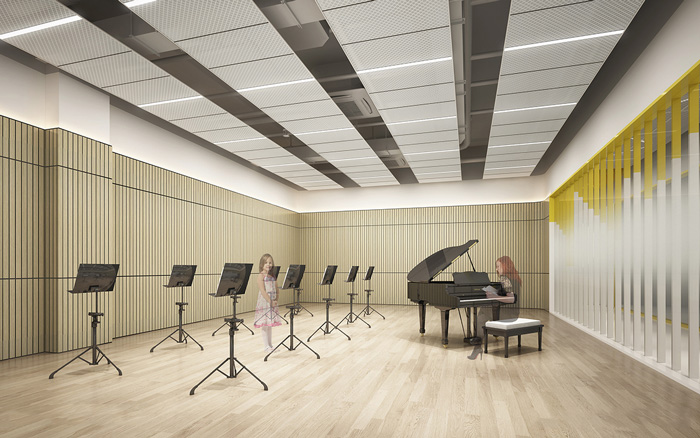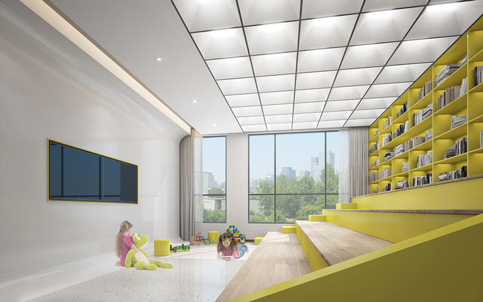 此處藝術學校設計中,告別了五彩斑斕的顏色,突出了空間的簡潔與干凈,用黃色做為點綴色提升空間的趣味性。