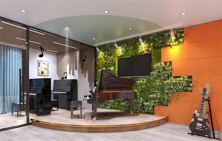 前廳不變的情況下,logo背景墻色調偏重,所以運用了色彩降噪,添加了一些偏冷色調,不僅能夠提升整個空間的舒適感,還能給孩子一個安全、放松的空間。結合了logo的主色調,再進行色彩搭配可以形成歡快、親切、活潑的色彩氛圍。與此同時還設置了也增加了兩間鋼琴室,提高了空間利用率。大廳玻璃教室內墻面貼了吸音板,一方面體現機構在音樂上的專業性,另一方面就是讓空間的隔音效果做到最佳,讓孩子在學習的時候不受干擾,能夠安靜的學習。